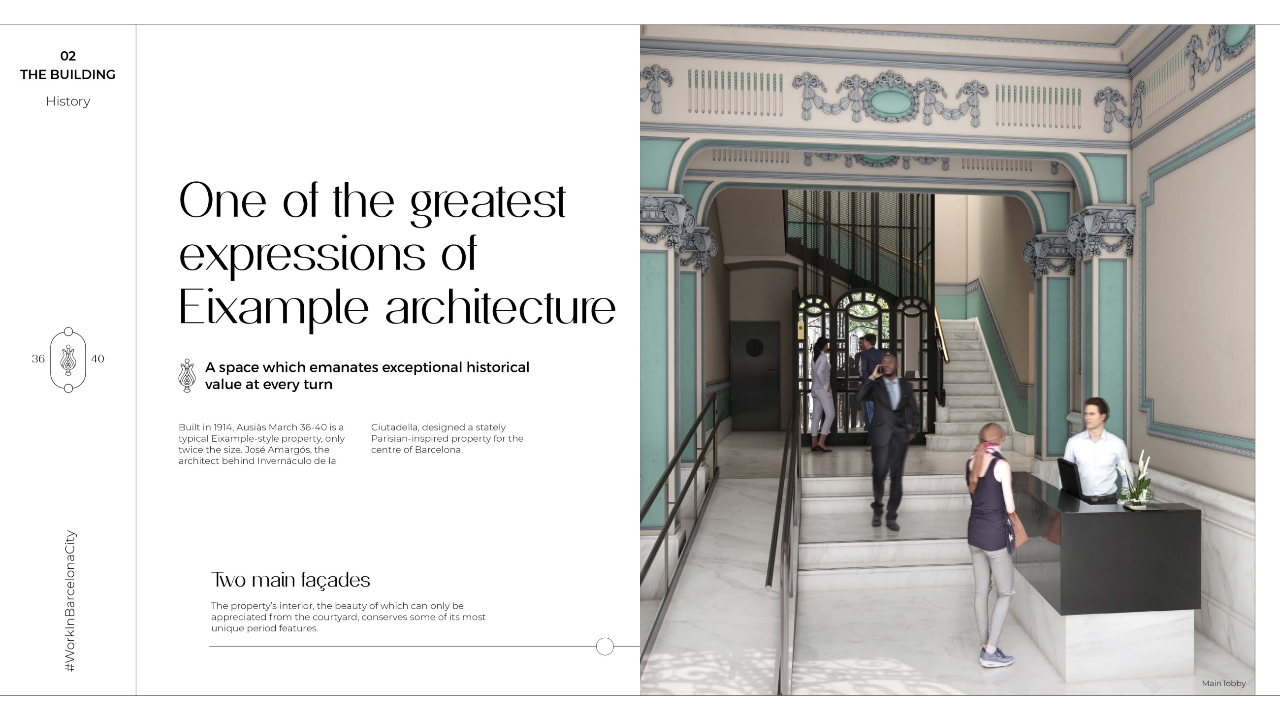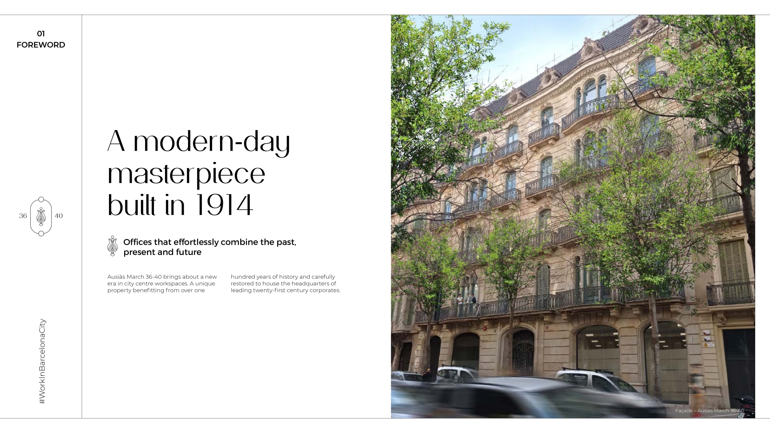 One of the greatest expressions of Eixample architecture, Ausiàs March 36-40 was built in 1914 and it now belongs to a new era in city centre workspaces.